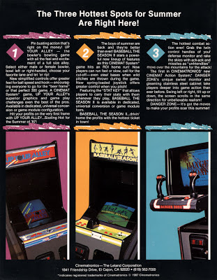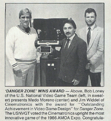 As with World Series, Danger Zone was an "all-hands-on-deck" effort with most of the programmers, engineers, and artists pitching in. Thegame just barely made it into Replay's top ten, though it did top the new game charts twice, indicating that it probably wasn't widely distributed. The game did appear in an exhibit at the Smithsonian.