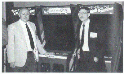 In 1987, Cinematronics Chapter 11 issues would finally be solved, though not perhaps in a way that anyone expected. On March 30th, Cinematronics was purchased by Tradewest. Tradewest was headed Leland Cook (a Texas millionaire whose ever-present cowboy hat never failed to charm Japanese video game executives). Cook had gotten into the coin-op business in 1974 when he bought Cranford Vending and renamed it Master Vend. He later added a music and games route and, in 1982, an amusement sales division. The following year, Master Vend entered the distributing business. Master Vend started out distributing Konami and Interlogic games and soon became the biggest kit distributor in the state. Not bad for a company headquartered in Corsicana - a rural town of 25,000 best known for its fruitcake. Cook (along with his son Byron) did it by getting into conversion kits at a time when most distributors were reluctant to do so (making money on dedicated units was especially difficult for rural operators) Other lines carried by Master Vend included Capcom, Arachnid (electronic darts), Dynamo, and Romstar. Master Vend was the exclusive Texas distributor for Romstar and the relationship led to the formation of a new company. In February of 1986 Byron and Leland Cook, along with John Rowe of Romstar formed a manufacturing company in Corsicana called Tradewest. Tradewest's first offering was Alpha Mission, a kit licensed from Japan's SNK (Rowe had a relationship with SNK president E. Kawasaki). It was the next game, however, that put Tradewest on the coin-op video game map. In February of 1986, SNK sent Tradewest some boards for a new game called Ikari Warriorsfor testing. Tradewest agreed to license the game and John Rowe went to Japan for five days of negotiations. In the end, Tradewest decided to manufacture an upright version of the game (Dynamo actually built the games) and ended up with a #1 hit. The follow-up, Victory Road, was almost as successful.